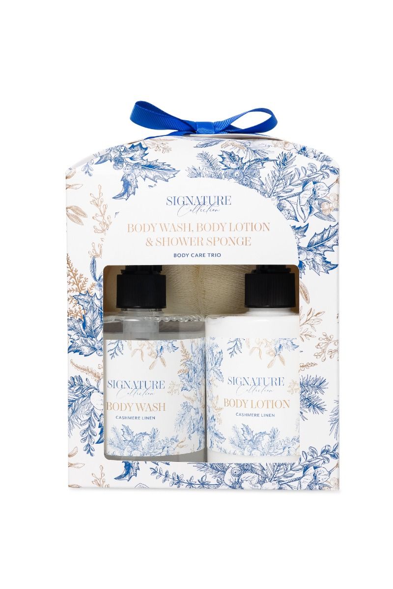 Signature Collection Body Care Trio inneholder Body Lotion, Body Wash med deilig duft av Cashmere Linen, samt en pen dusjsvamp.